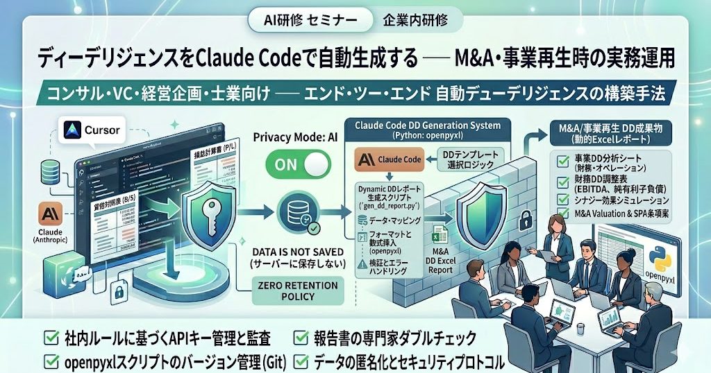 この記事では、DD ExcelをClaude Code+openpyxlで動的生成する設計と、実務運用での勘どころを整理します。コンサル・VC・中小企業診断士・認定支援機関業務を想定しています。