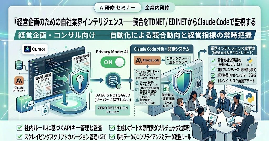 この記事では、EDINETとTDNETの公開データを使って、自社業界に特化した開示監視基盤をClaude Codeで自作する方法を整理します。投資家向けのツールではなく、経営企画の意思決定資料として使う設計です。