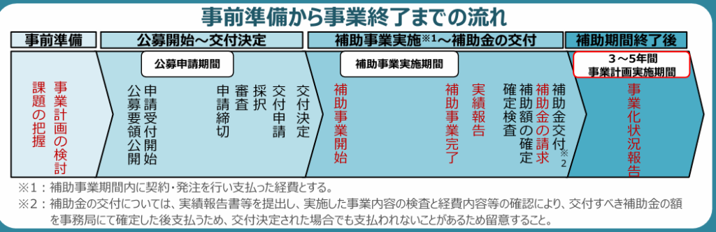 事前着手制度: 交付決定前に発生した経費(M&A着手金など)も対象にできる「事前着手届出」の仕組みがありますが、適用条件は公募回ごとに異なるため必ず最新要領を確認してください。